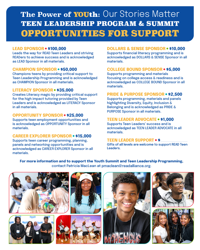 We thank the mission-aligned corporations, foundations, and individuals who partner with Read Alliance to provide opportunities that propel Teen Leaders and striving READers toward excellence.